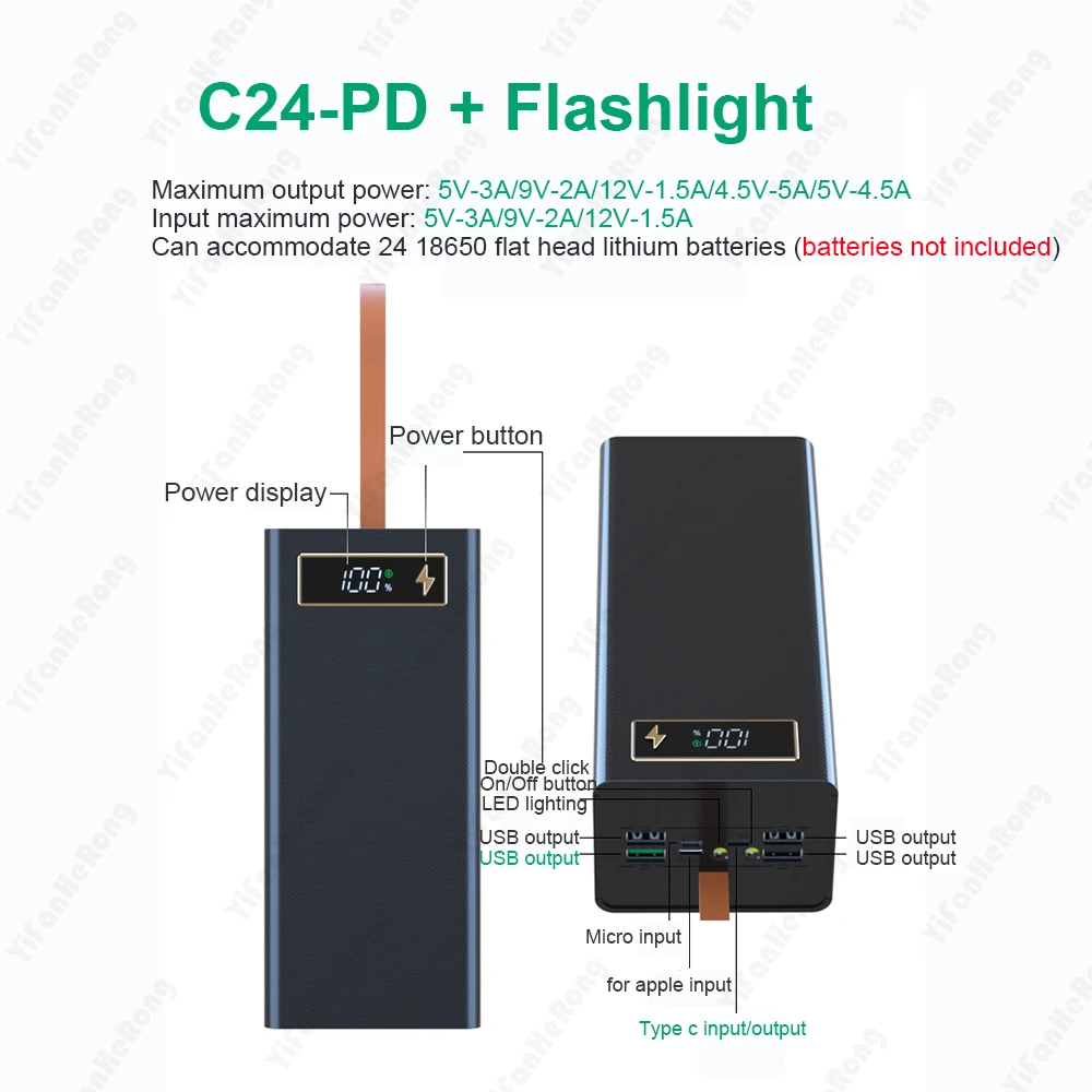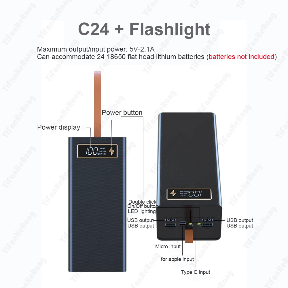 This C24 charger case is designed to hold and charge two 18650 rechargeable batteries while serving as a portable power bank. It features dual USB output ports, turning your 18650 cells into a flexible power source.